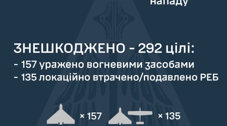 Станом на 09:30 протиповітряною обороною знешкоджено 292 ворожі БпЛА типу Shahed (безпілотники інших типів). 157 — збито вогневими засобами ураження, 135 — локаційно втрачені/подавлені РЕБ.