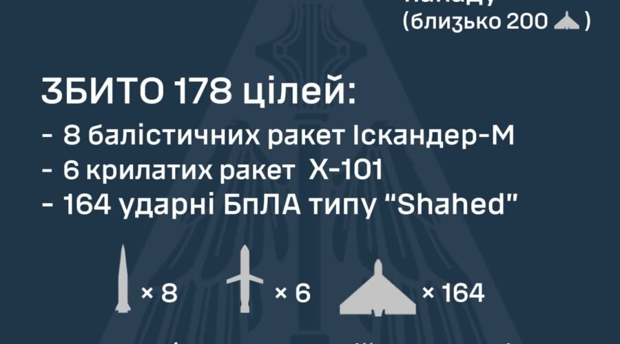 За попередніми даними, станом на 10:00 протиповітряною обороною збито 178 засобів повітряного нападу противника: