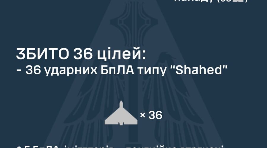 За попередніми даними станом на 08:30 протиповітряною обороною збито 36 ворожих БпЛА типу Shahed (безпілотників інших типів) на півночі та сході країни. Крім того, 5 дронів-імітаторів – локаційно втрачені/подавлені РЕБ.