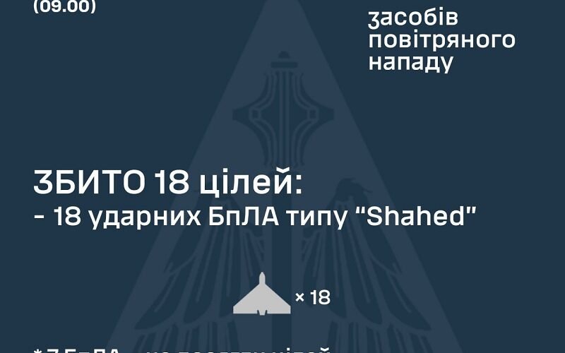 “За попередніми даними, станом на 09.00 протиповітряною обороною збито 18 ворожих БпЛА типу Shahed (безпілотників інших типів) на півночі та сході країни”, – йдеться у повідомленні.
