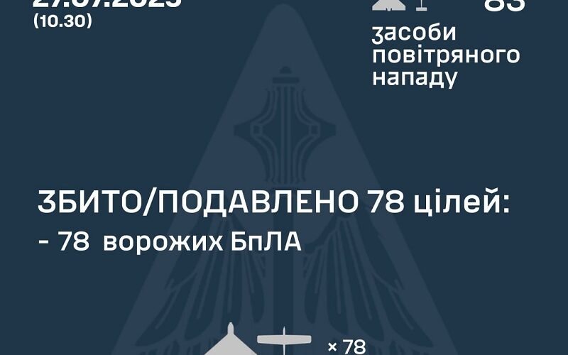 У Повітряних Силах повідомили що у ніч на 27 липня росіяни атакували Україну 83-ма ударними БпЛА, передає Хронікерс.