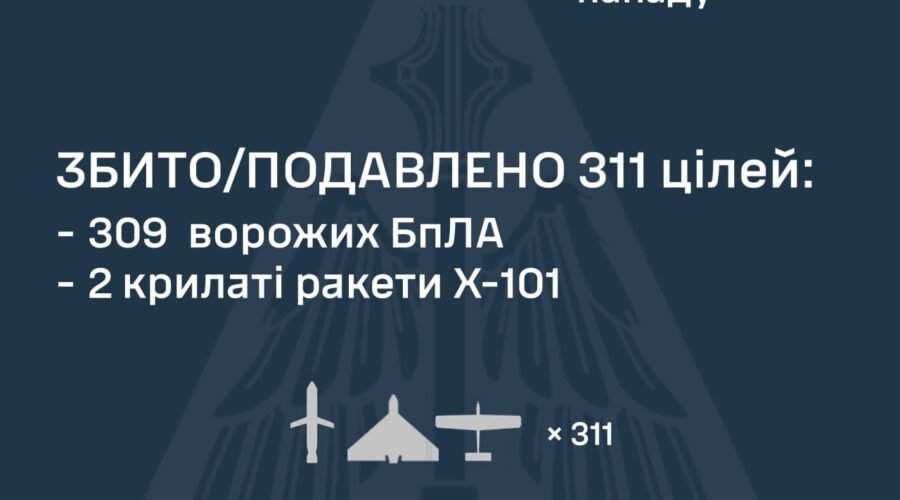 За попередніми даними, станом на 09:30, протиповітряною обороною збито/подавлено РЕБ 311 засобів повітряного нападу противника: