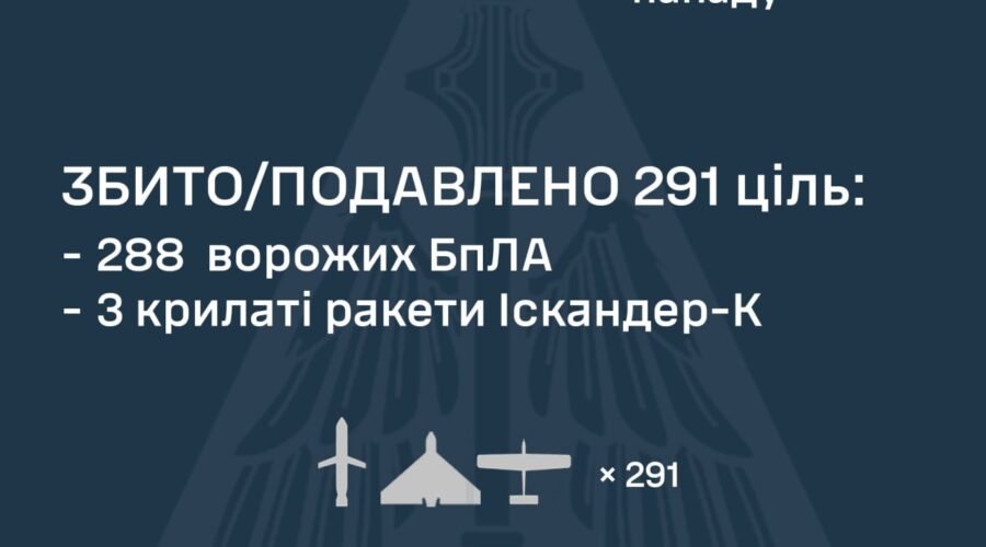 За попередніми даними, станом на 09:00 протиповітряною обороною збито/подавлено РЕБ 291 засіб повітряного нападу противника: