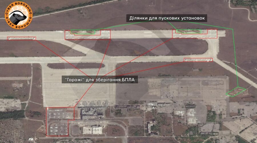 За інформацією «КіберБорошна», окупанти зводять закриті майданчики для зберігання БпЛА біля термінала аеропорту, облаштовують пункти ручного управління, зони для розвантаження бойових частин, хибні позиції, пости повітряного спостереження, а також готують злітну смугу.