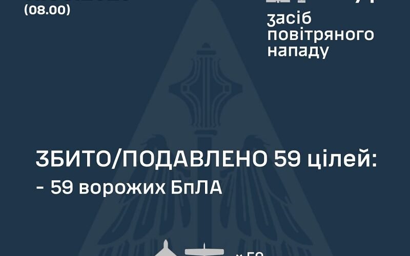 “За попередніми даними, станом на 08.00, протиповітряною обороною збито/подавлено 59 ворожих БпЛА типу Shahed і дронів-імітаторів різних типів на півночі, півдні та сході країни”, – йдеться у повідомленні.