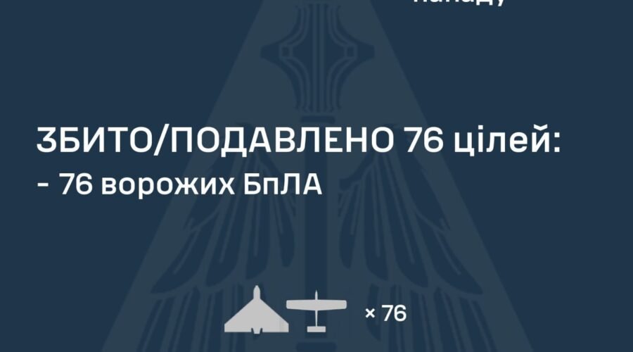 За попередніми даними, станом на 08:00, протиповітряною обороною збито/подавлено 76 ворожих БпЛА на півночі та сході країни.