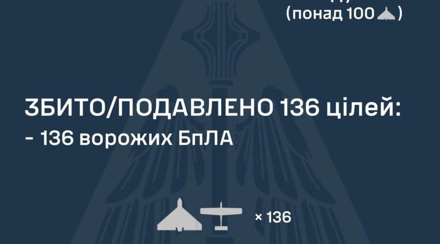 За попередніми даними, станом на 09:30, протиповітряною обороною збито/подавлено 136 ворожих БпЛА на півночі, півдні та сході країни.