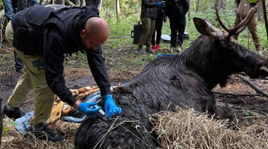 Працівники взяли зі собою портативний рентген, аби з’ясувати чи є у лося переломи.