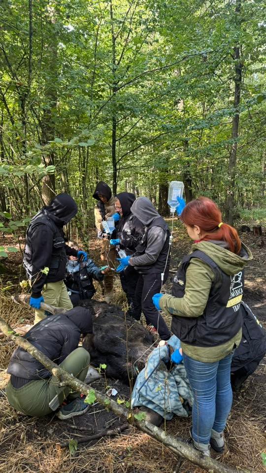 «Вчора пізно ввечері надійшов важкий виклик про те, що в лісі у Рівненськай області від неділі лежить у болоті лось. Що трапилось — невідомо. Командою з 9 домівчан ми на місці від 7 ранку», — повідомив він.