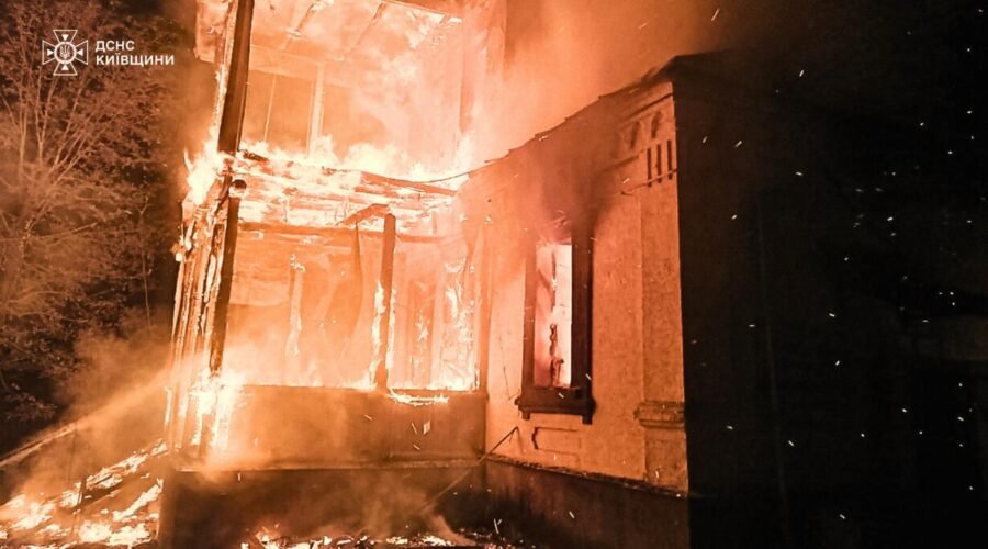 “Вночі у місті Буча внаслідок атаки БпЛА виникла пожежа двоповерхової будівлі недіючого санаторію”, – йдеться в повідомленні.
