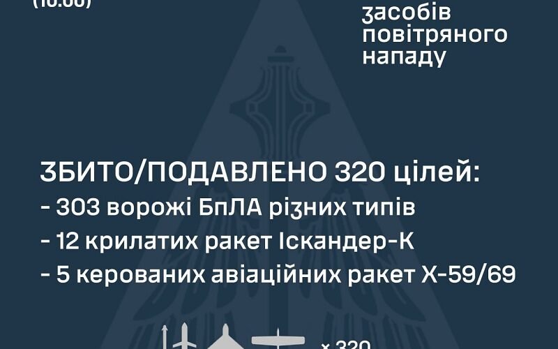 “За попередніми даними, станом на 10.00, протиповітряною обороною збито/подавлено 320 повітряних цілей: 303 ворожі БпЛА типу Shahed, Гербера (безпілотники інших типів); 12 крилатих ракет Іскандер-К; 5 керованих авіаційних ракет Х-59/69”, – йдеться у повідомленні.