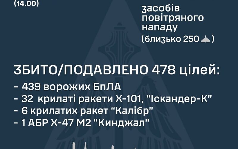 За попередніми даними, станом на 14.00, протиповітряною обороною збито/подавлено 478 повітряних цілей: 439 ворожих БпЛА типу Shahed, Гербера (безпілотники інших типів); 1 аеробалістичну ракету Х-47 М2 “Кинджал”; 32 крилаті ракети Х-101/Іскандер-К; 6 крилатих ракет “Калібр”.