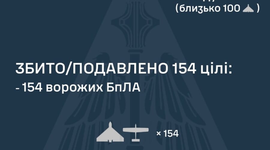 За попередніми даними, станом на 09:00, протиповітряною обороною збито/подавлено 154 ворожих БпЛА на півночі, півдні, сході та в центрі країни.