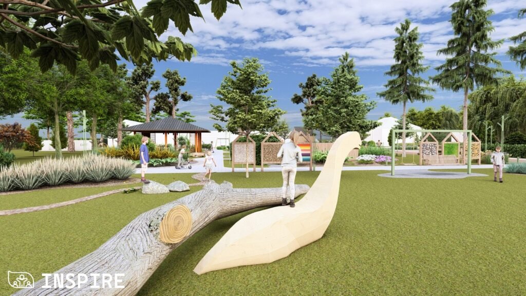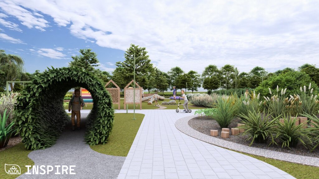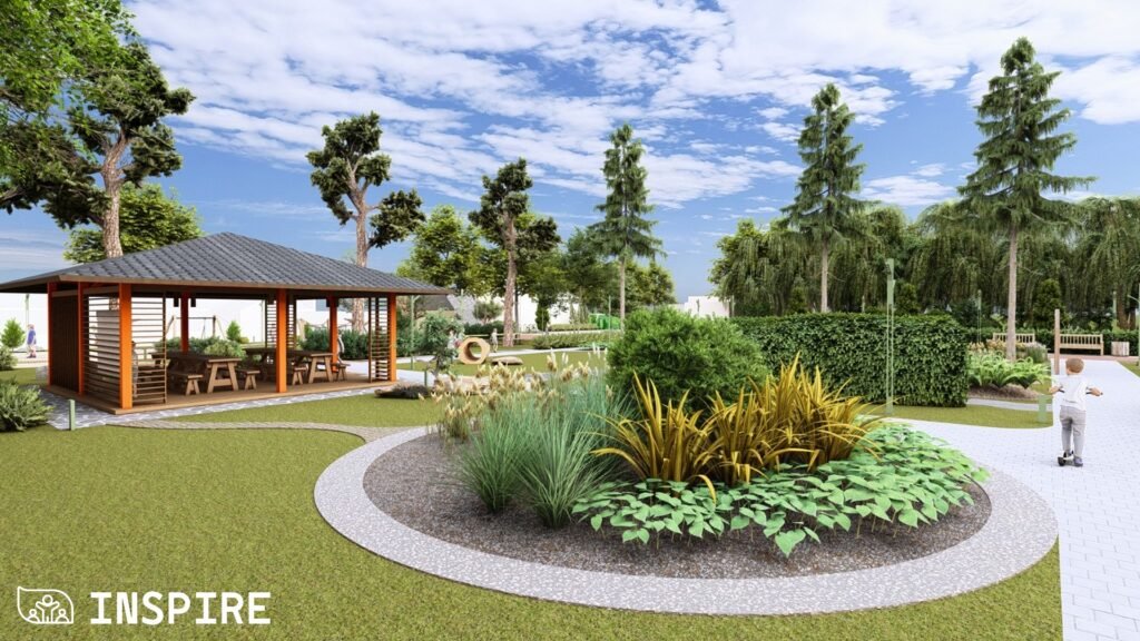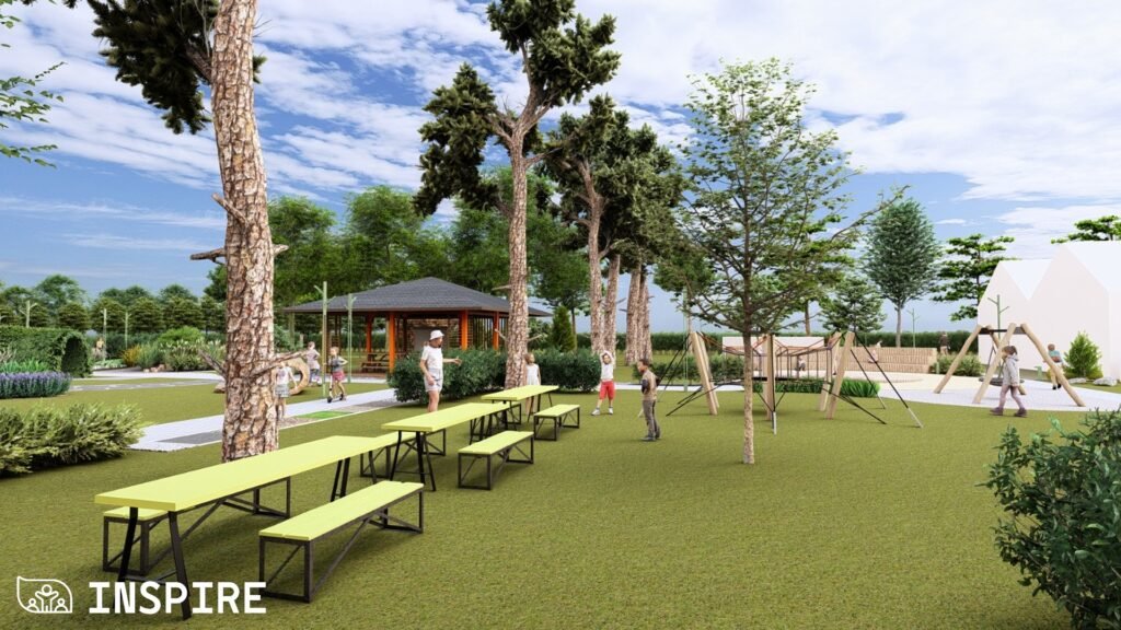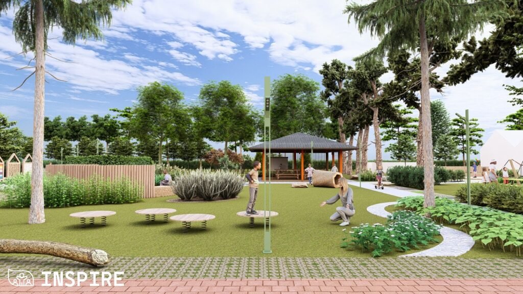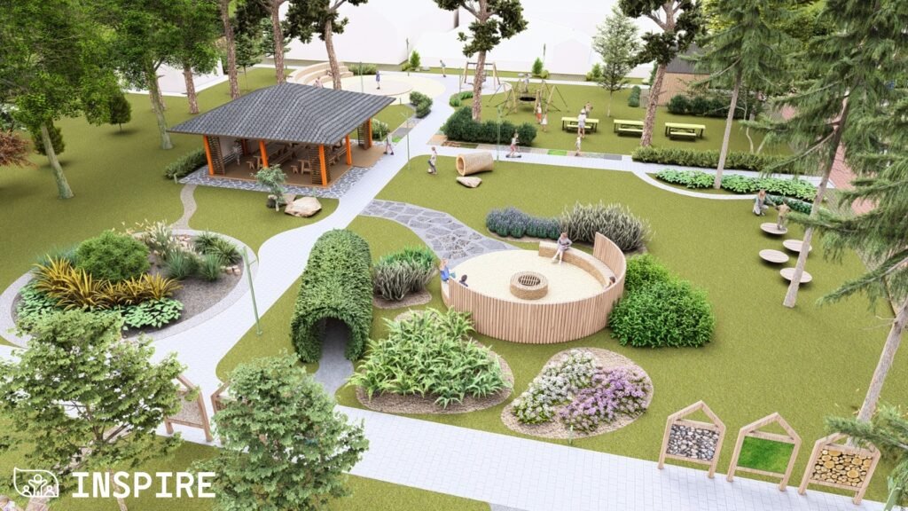 Особливу увагу приділили збереженню старих дерев і фруктового саду, а також озелененню новими, стійкими до кліматичних змін видами рослин. Нові пішохідні доріжки, садові стежки, еко-панелі сенсорики та зони «доріжок відчуттів» сприятимуть розвитку сприйняття, допитливості й гармонійному відпочинку дітей.
