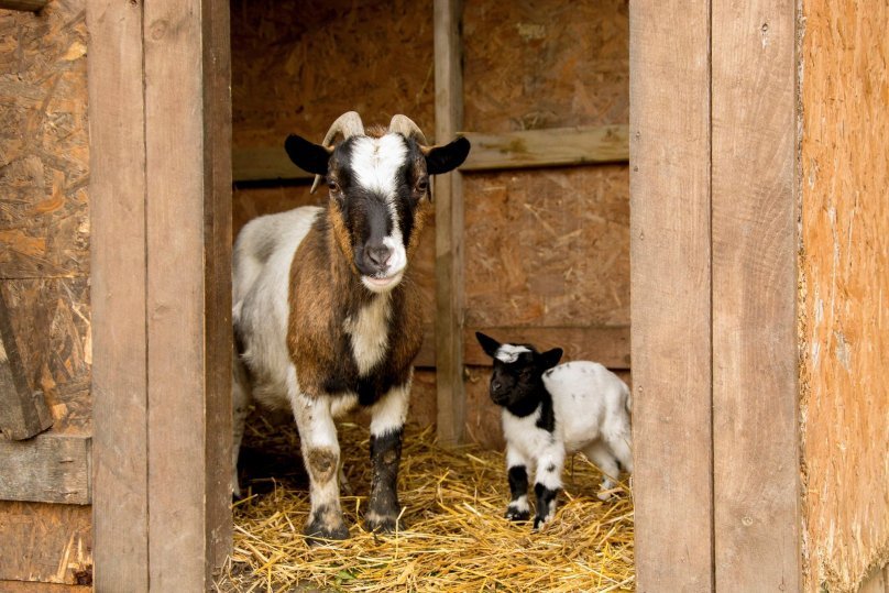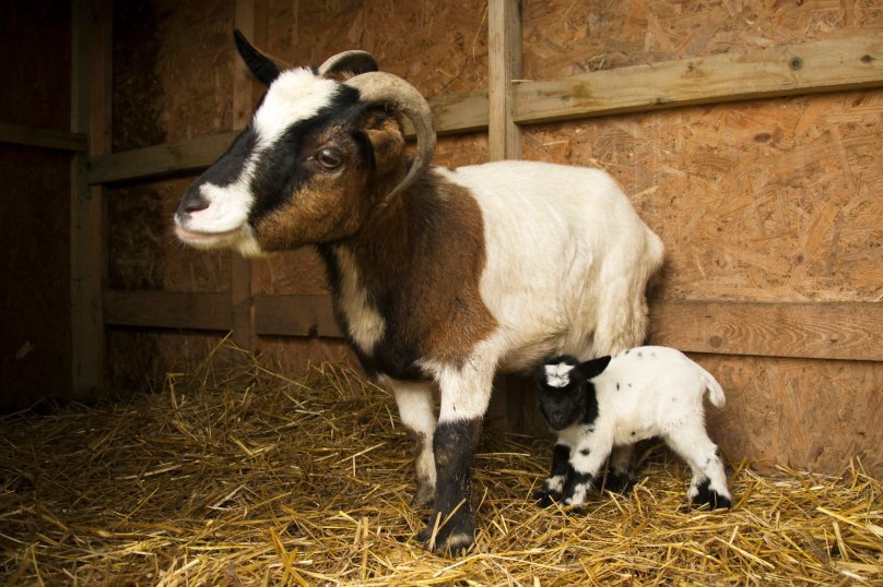 До слова, камерунські кози — це декоративна порода невеликого зросту з короткими ногами та характерним забарвленням: великі коричневі або чорні плями на білому фоні. Особливістю породи є виразні міцні роги як у самців, так і у самиць.