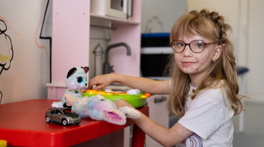 Після тривалого лікування за кордоном 7‑річна Аня Дерека з Київщини повернулася до львівських спеціалістів, які у січні 2023 року стабілізували її стан та готували до транспортування далі на захід. Нині ж у дитячій лікарні святого Миколая Першого медоб’єднання Львова дівчинці шліфують післяопікові рубці.