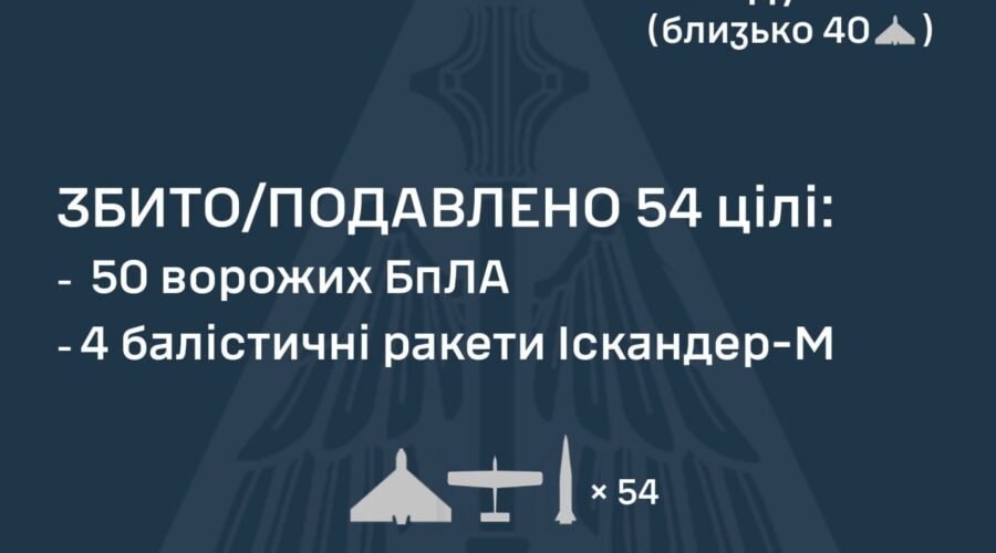 За попередніми даними, станом на 09:00, протиповітряною обороною збито/подавлено 4 балістичні ракети та 50 ворожих БпЛА на півночі, півдні та сході країни.