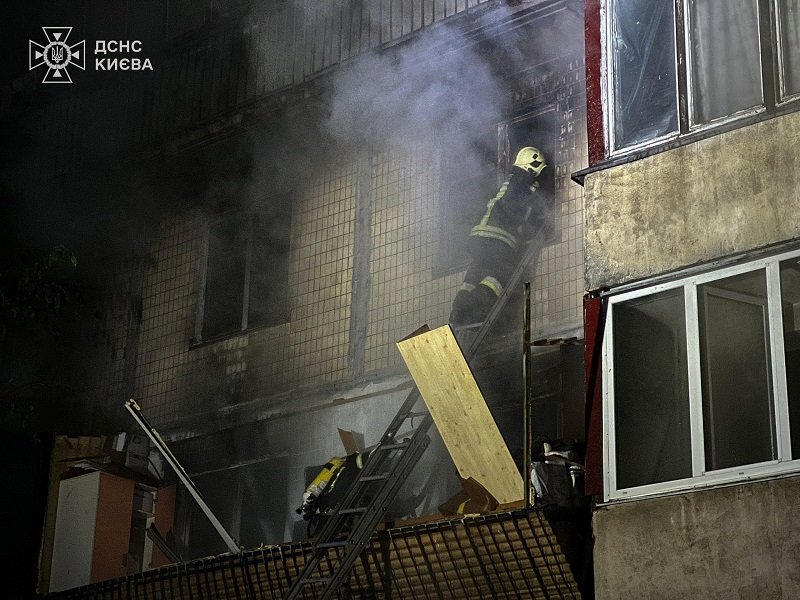 За даними рятувальників, ліквідовують наслідки обстрілу БпЛА у Деснянському районі, де сталися пожежі. На одній з локацій внаслідок влучання БпЛА сталось загоряння в 9-ти поверховому житловому будинку, з верхніх поверхів було врятовано 13 осіб.
