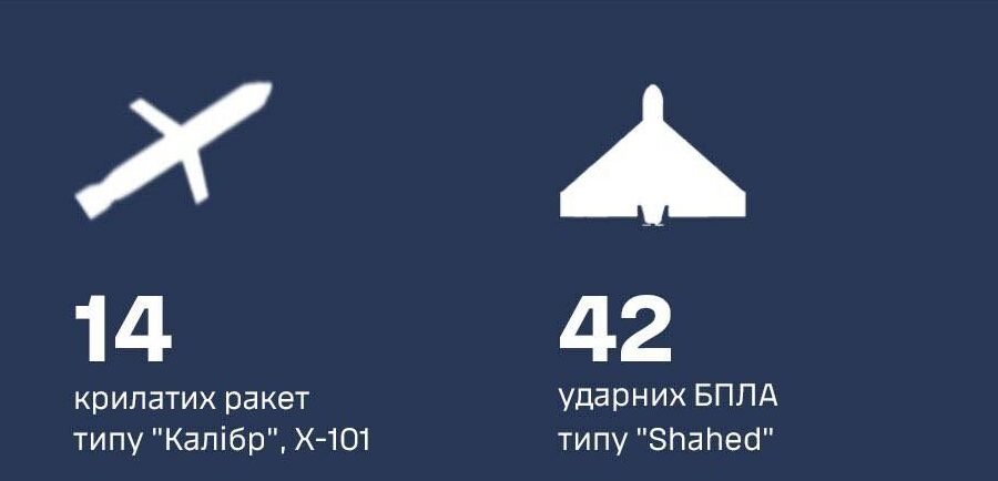 Підрозділи протиповітряної оборони та авіація повітряного командування «Захід» в зоні своєї відповідальності знищили 14 крилатих ракет та 42 ударних БпЛА типу «Shahed».