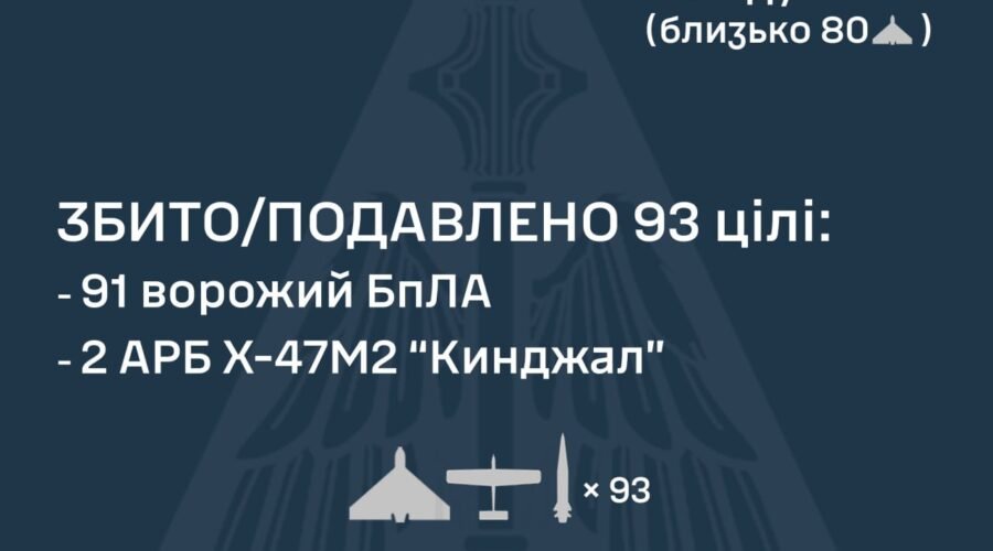 За попередніми даними, станом на 09:00, протиповітряною обороною збито/подавлено дві аеробалістичні ракети Х-47М2 “Кинджал” та 91 ворожий БпЛА на півночі, півдні та сході країни.