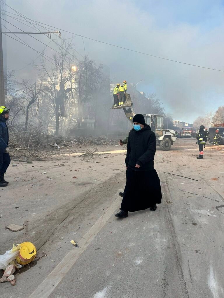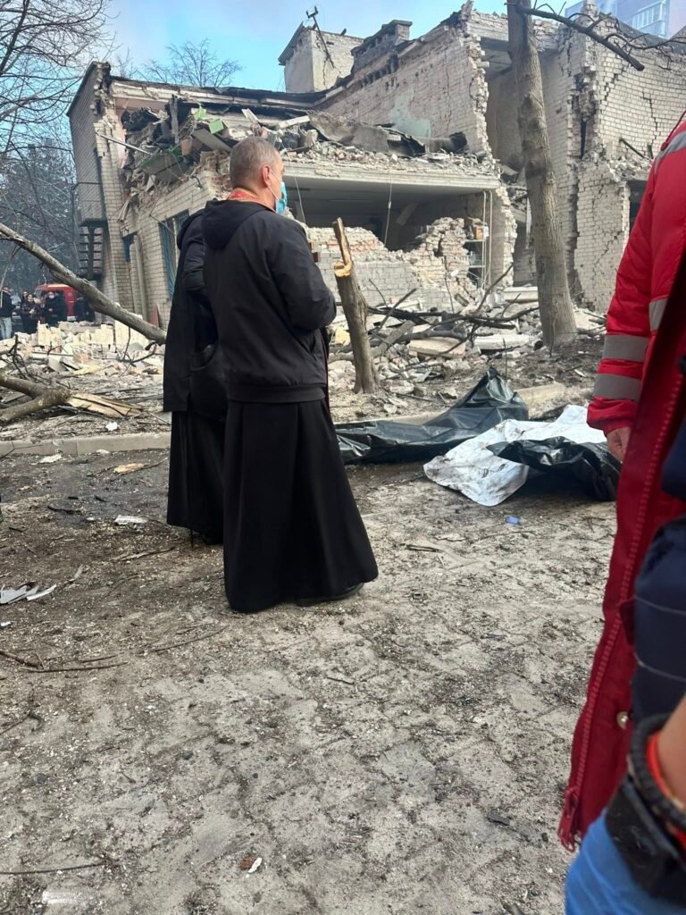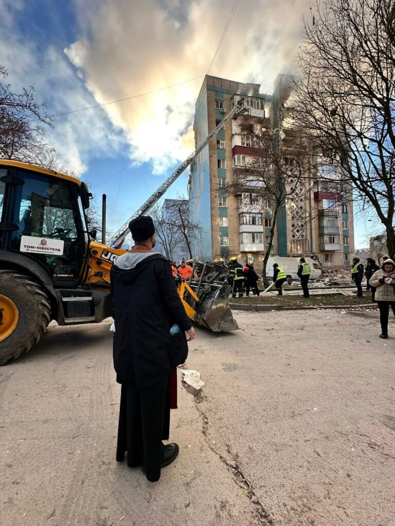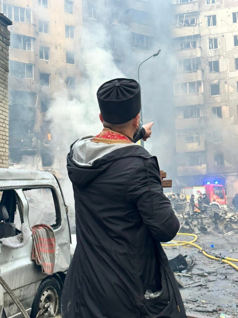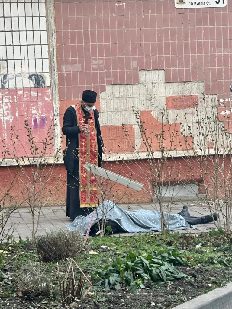 На тротуарі просто посеред руїн будинків лежать тіла загиблих людей, над ними моляться священники.