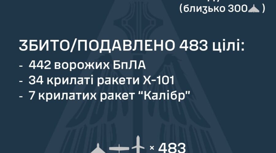 За попередніми даними, станом на 10.00, протиповітряною обороною збито/подавлено 483 повітряні цілі: