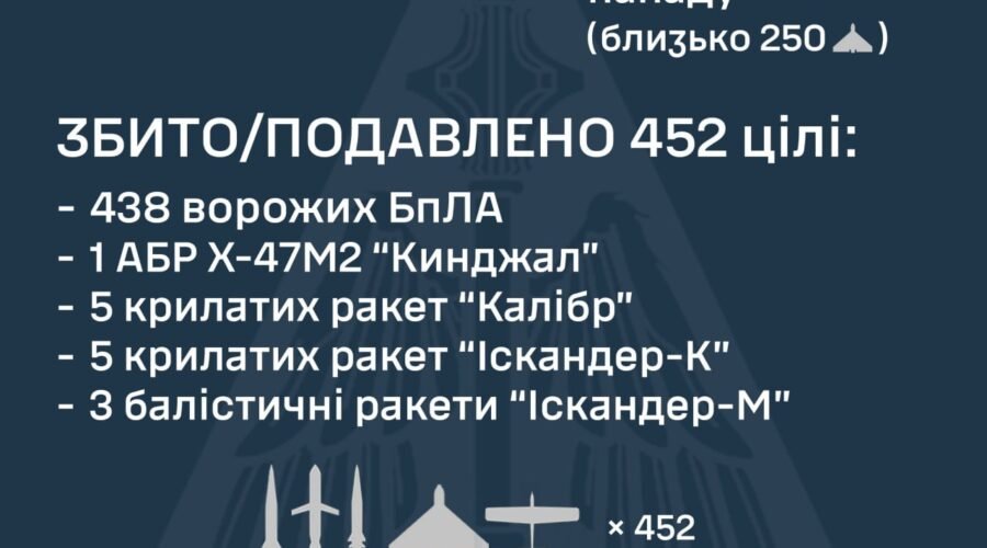 За попередніми даними, станом на 10.00, протиповітряною обороною збито/подавлено 452 повітряні цілі: