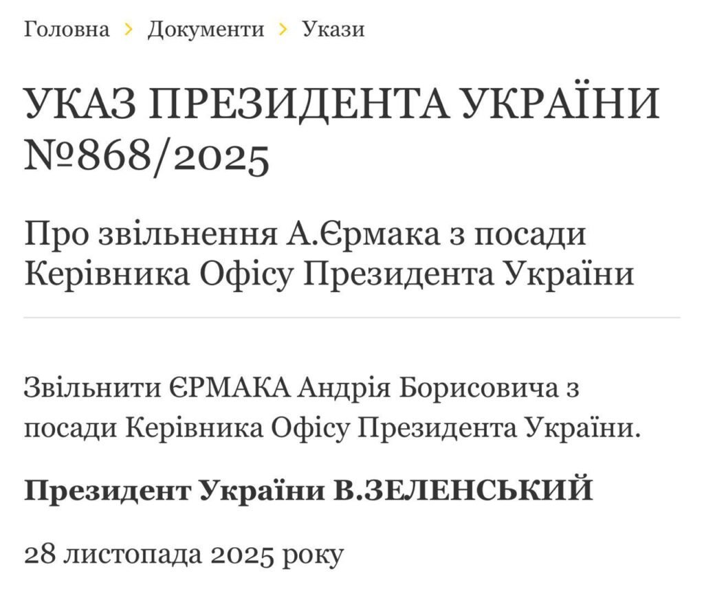 Президент України Володимир Зеленський підписав Указ про звільнення Андрія Єрмака з посади голови Офісу президента, передає Хронікерс.