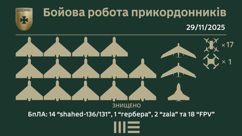 Зокрема, бійці 5 прикордонного загону ліквідували 11 “шахедів”, 1 “герберу”, 1 “залу” та 18 FPV-дронів, з яких 1 був керований за допомогою оптоволокна.