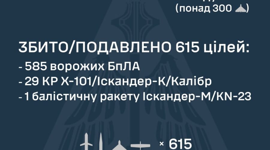 За попередніми даними, станом на 10.00, протиповітряною обороною збито/подавлено 615 повітряних цілей: