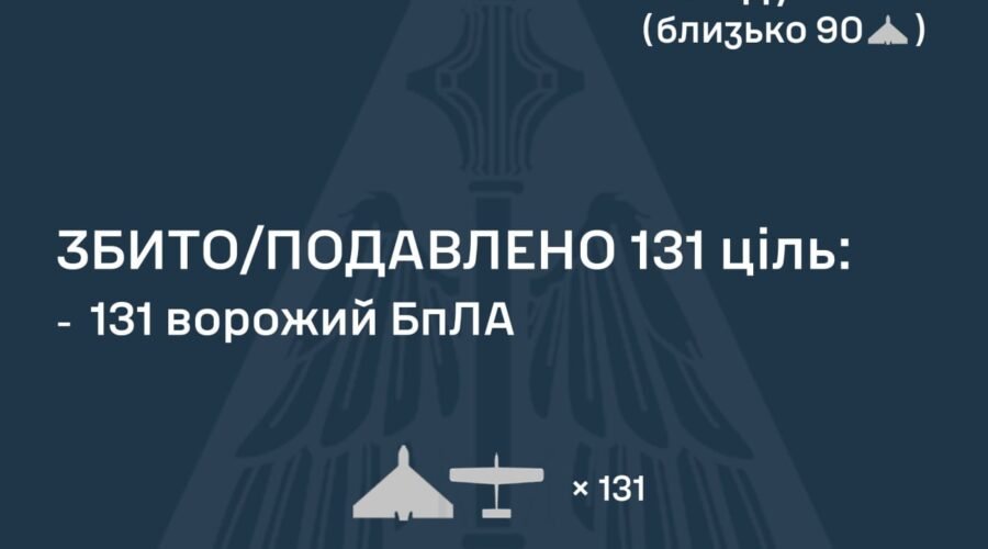 За попередніми даними, станом на 09:00, протиповітряною обороною збито/подавлено 131 ворожий БпЛА на півночі, півдні та сході країни.