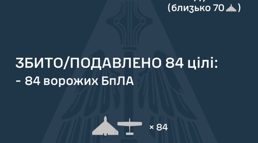За попередніми даними, станом на 09:00, протиповітряною обороною збито/подавлено 84 ворожі БпЛА на півночі, півдні та сході країни.