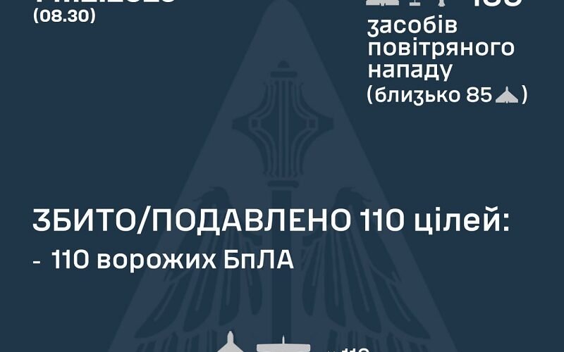 “За попередніми даними, станом на 08:30, протиповітряною обороною збито/подавлено 110 ворожих БпЛА типу Shahed, Гербера і дронів інших типів на півночі, півдні та сході країни”, – йдеться у повідомленні.