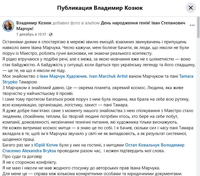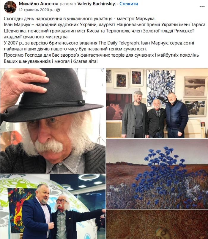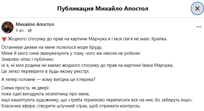 Михайло Апостол написав пост у фейсбуку, що він і його син не мають жодного стосунку до авторських прав на спадщину Марчука.