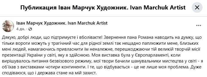 «Тільки вороги можуть у трагічний час для рідної землі так нещадно паплюжити мене, близьких мені людей, намагаючись привласнити їм неналежне, перешкоджаючи тій великій творчій місії презентації України у світі, яку я здійснюю. Моя виставка була у Європарламенті, коли вирішувалось питання безвізового режиму, мої твори бачили шанувальники мистецтва у світі – я обʼїхав з виставками чотири континенти. І те, що відбувається – це не лише моя проблема. Дуже сподіваюся, що і держава стане на мій захист», – зазначив митець.