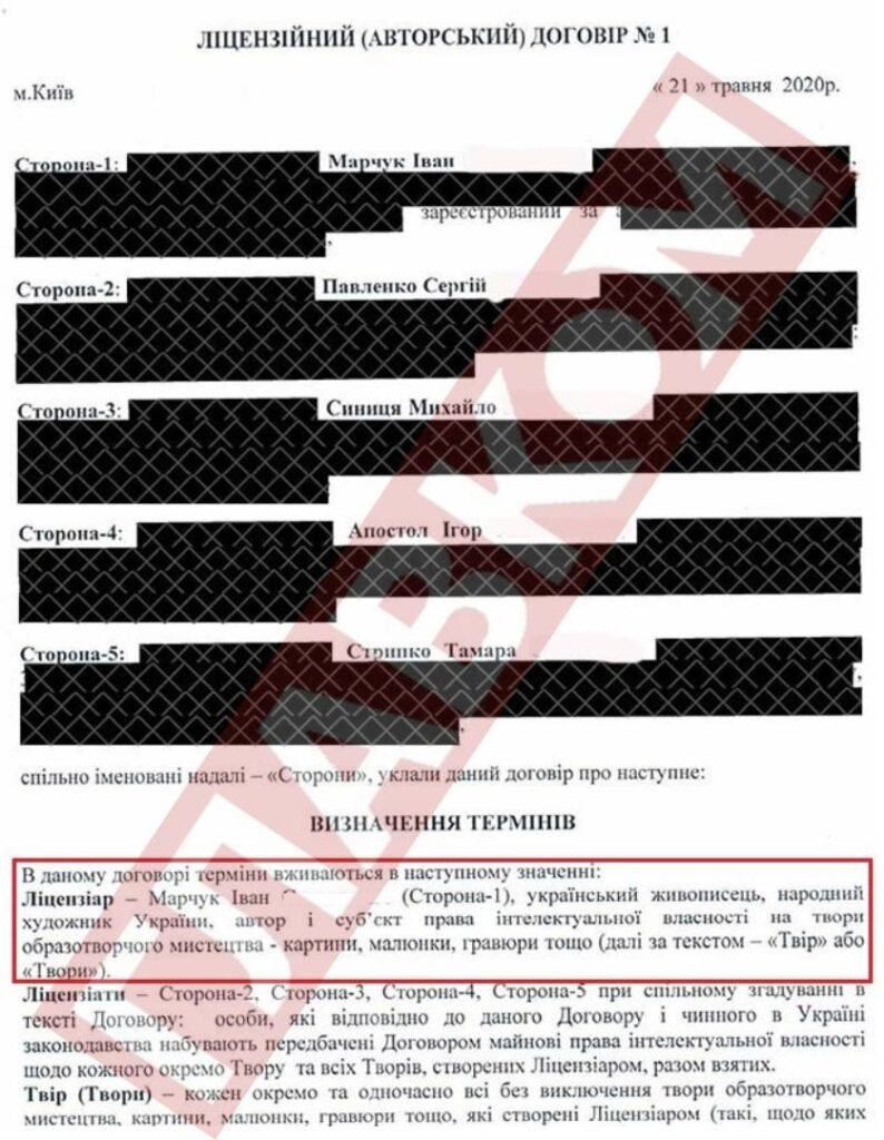 На перший погляд ситуація проста. 21 травня 2020 року у майстерні Марчука у Києві відбулося підписання договору на передачу виключної ліцензії на використання авторських прав на зображення всіх картин Марчука терміном на 100 років за 10 тис. грн. Підписав документ сам Маестро, його багаторічна помічниця Тамара Стрипко, а також адвокат з Дніпра Сергій Павленко, одеський бізнесмен Михайло Синиця і син колишнього народного депутата, ексрадника міністра внутрішніх справ Арсена Авакова та земляк митця Михайла Апостола – Ігор. Останнім чотирьом і передавалися права на картини.