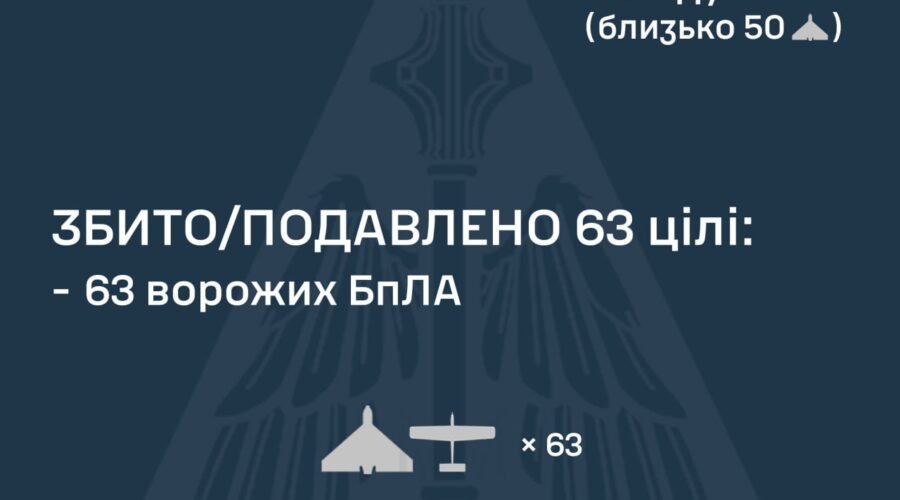 За попередніми даними, станом на 08:30, протиповітряною обороною збито/подавлено 63 ворожих БпЛА на півночі, півдні, сході та в центрі країни.