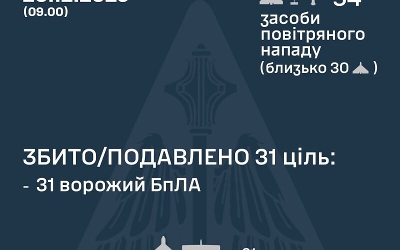 “За попередніми даними, станом на 09:00, протиповітряною обороною збито/подавлено 31 ворожий БпЛА типу Shahed, Гербера і дрони інших типів на півночі, півдні та сході країни”, – йдеться у повідомленні.