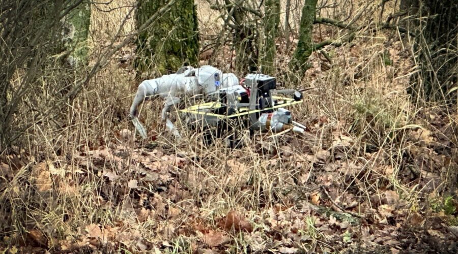 Розташувавшись на відстані кількох десятків метрів від ворожого дрона, вибухотехніки поліції запустили до об’єкта дослідження “робото-пса”, щоб переконатися, що поряд з FPV-дроном немає додаткових пасток, і до нього можна безпечно підійти.