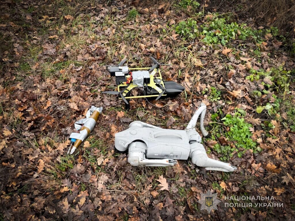 За інформацією правоохоронців, ворожий безпілотник квадрокоптерного типу, що ніс на собі заряд вибухівки, було виявлено в лісосмузі поряд з дорогою.
