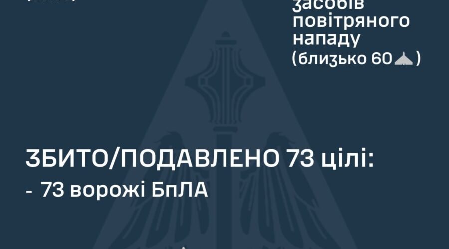 “За попередніми даними, станом на 09:00, протиповітряною обороною збито/подавлено 73 ворожі БпЛА типу Shahed, Гербера і дрони інших типів на півночі, півдні та сході країни”, – йдеться у повідомленні.