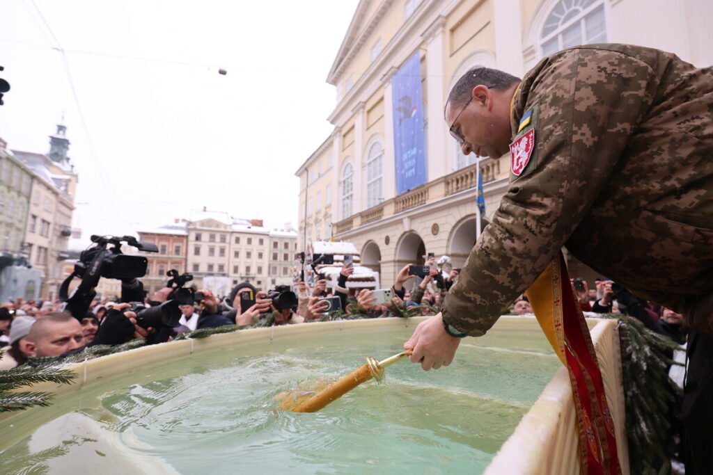 Сьогодні, на свято Богоявлення Господнього, у Львові на площі Ринок вже традиційно відбувся Чин освячення води. Воду освятили священики та військові капелани різних конфесій. Упродовж дня львів’яни та гості міста можуть прийти на площу Ринок і набрати свяченої води до своїх домівок. Води вистачить усім, адже у ємності — 1500 літрів.