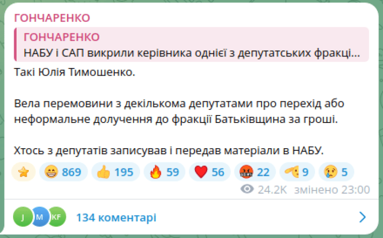 Згодом народний депутат Олексій Гончаренко заявив, що фігурантом розслідування НАБУ та САП проти керівника фракції у Верховній Раді є лідерка “Батьківщини” Юлія Тимошенко.