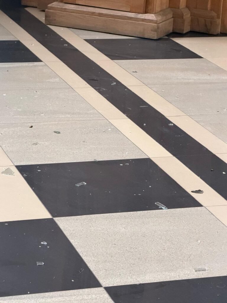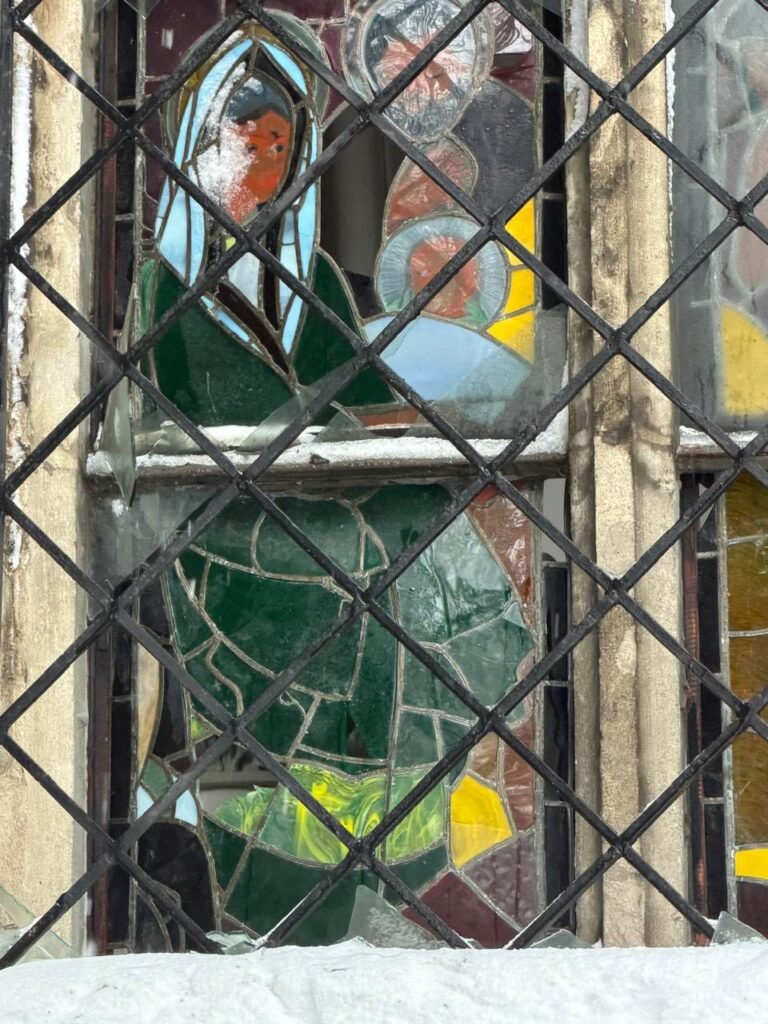 Пошкоджені вітражі авторства Валерія Шаленка у церкві, а також віконні заповнення у будівлі школи.
