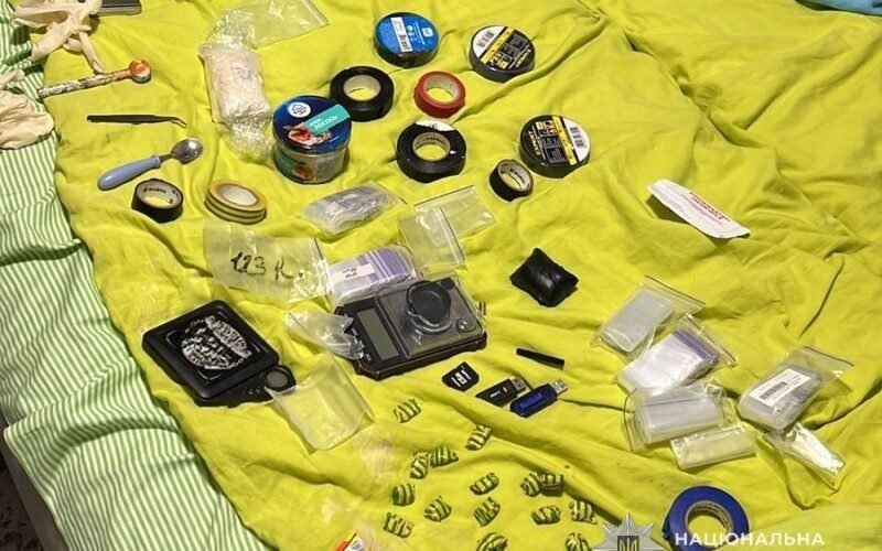 Там виявили та вилучили банки, пакунки, згортки, зіп-пакети та готові «закладки» з речовинами, схожими на психотропні, засоби для фасування, електронні ваги, чорнові записи та інші речові докази його причетності до протиправної діяльності.