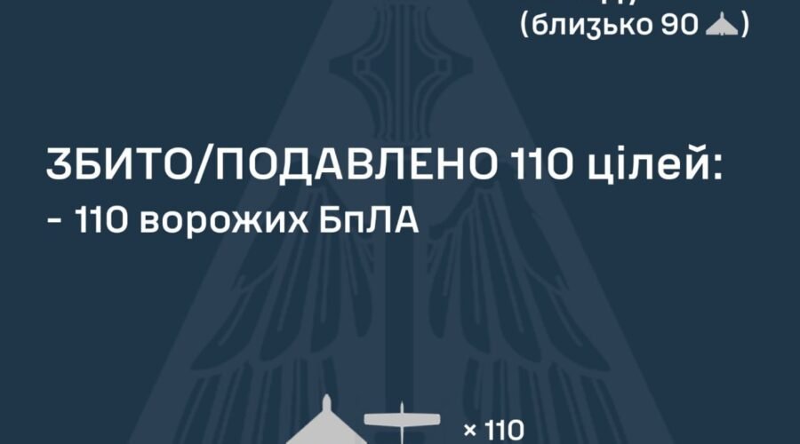 За попередніми даними, станом на 08:00, протиповітряною обороною збито/подавлено 110 ворожих БпЛА на півночі та сході країни.