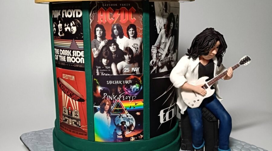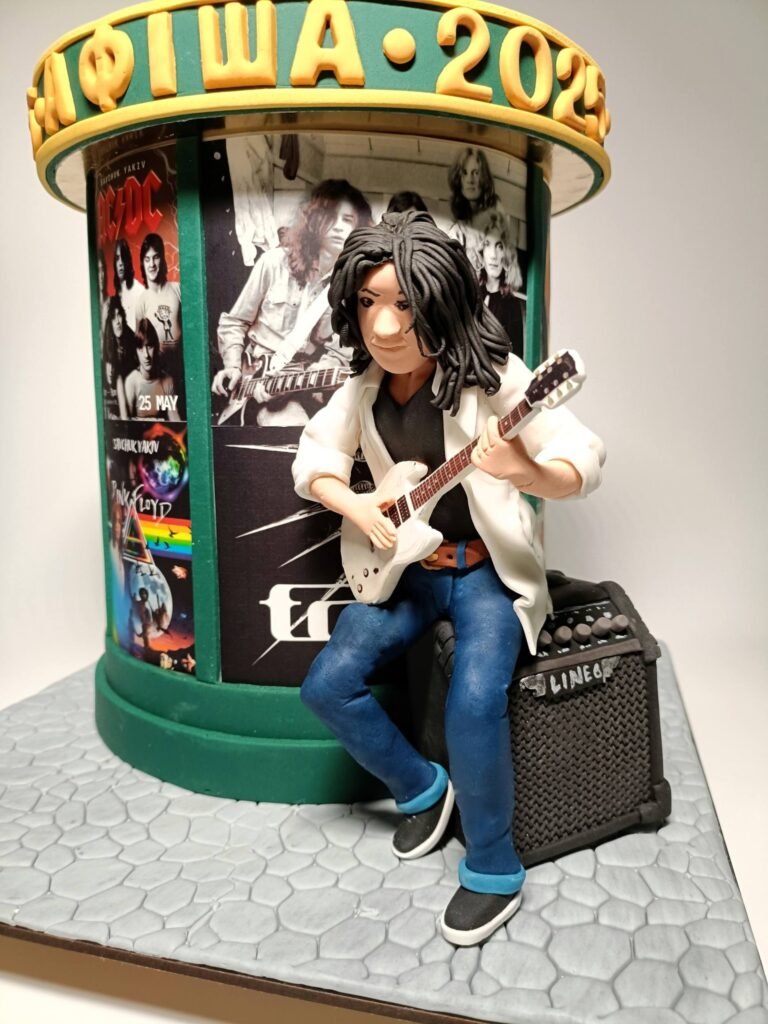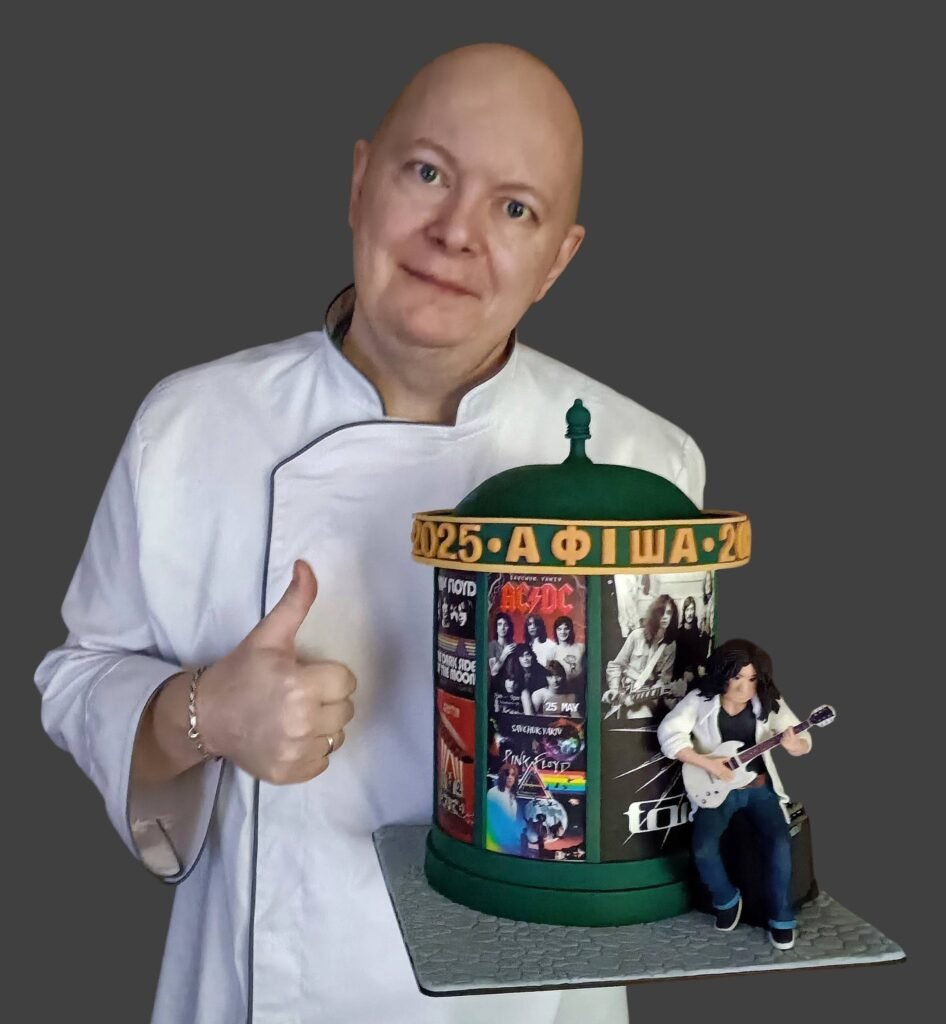 Відомий кондитер з Дніпра Дмитро Нікіфоренко представив свій новий кулінарний витвір – торт у вигляді афішної тумби, біля якою чоловік з гітарою, передає Хронікерс.