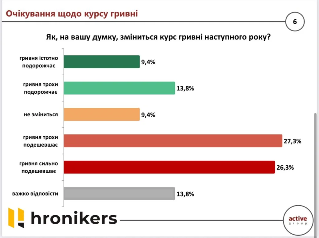 Знецінення гривні очікують 53,6% опитаних, із них 26,3% прогнозують різке падіння курсу. Натомість лише 23,2% респондентів очікують зміцнення гривні.