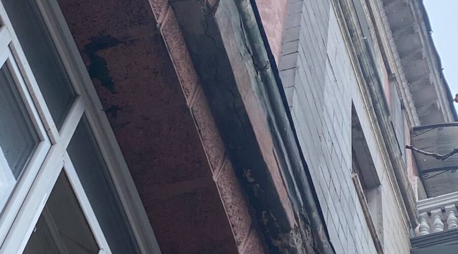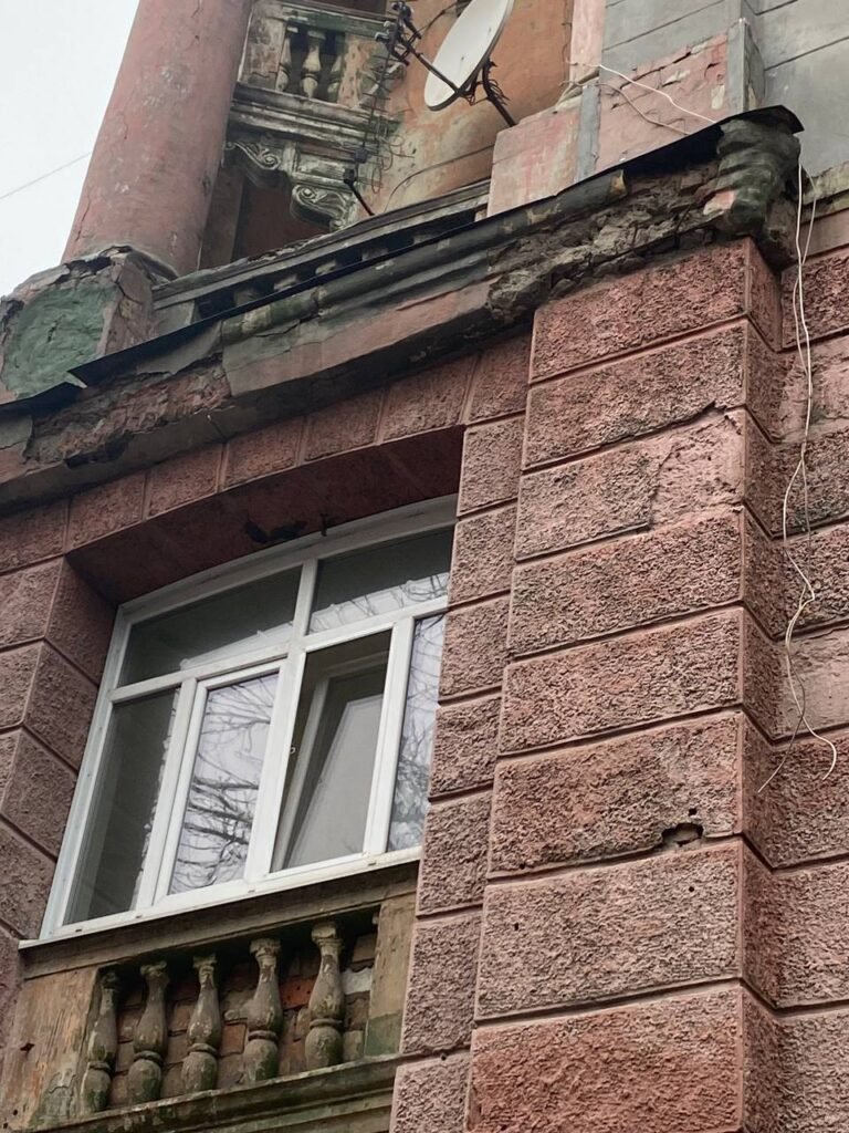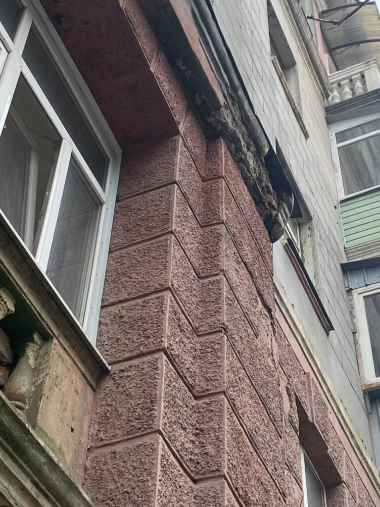 Бетонні блоки падають прямо на тротуар, де зазвичай проходить велика кількість людей. Будівля вже тривалий час перебуває в аварійному стані, хоча свого часу там робили ремонт.