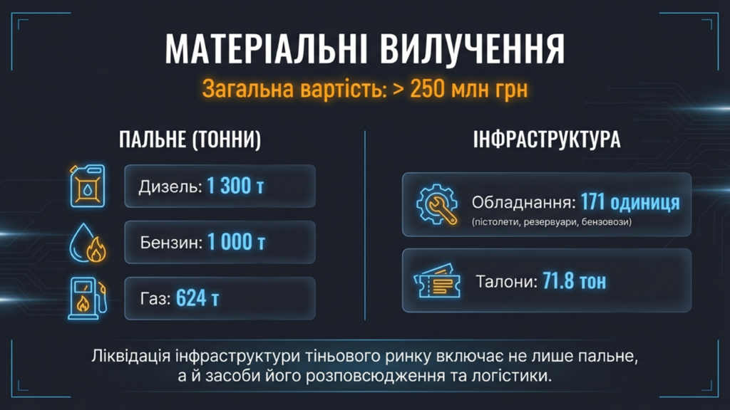 У 2025 році загальна орієнтовна вартість вилучених паливно-мастильних матеріалів, талонів та обладнання, пов’язаних з незаконним обігом, становить понад 250 млн грн.